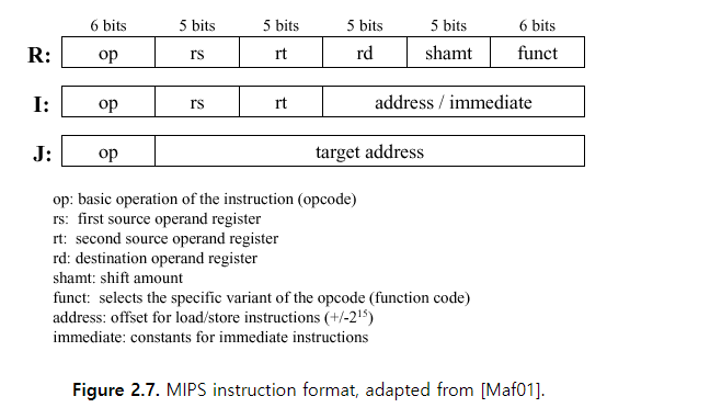 : MIPS ๊ตฌ์กฐ → 32๋นํธ๋ก ๊ณ ์ , ๋ชจ๋ ๋ช ๋ น์ด๋ R(Register), I(Immediate, ์์), J(Jump) ํ์ ์ค ํ๋๋ก ํํ๋จ