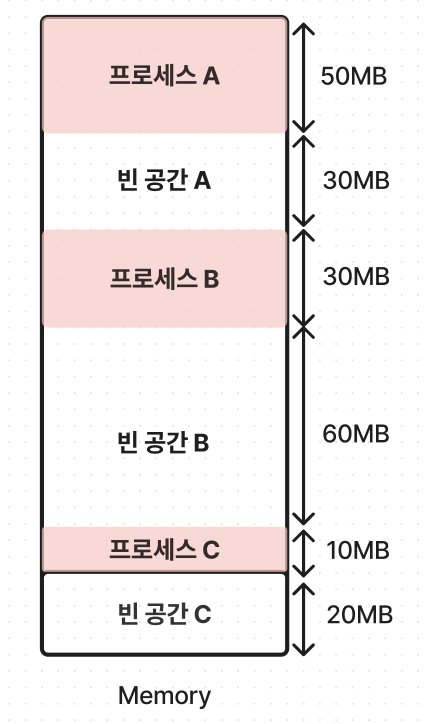 : ํ๋ก์ธ์ค๋ค์ด ์คํ๋๊ณ ์ข ๋ฃ๋๊ธฐ๋ฅผ ๋ฐ๋ณตํ๋ฉฐ ๋ฉ๋ชจ๋ฆฌ ์ฌ์ด์ ์๊ธฐ๋ ๋น ๊ณต๊ฐ, ์ด๋ณด๋ค ํฐ ํ๋ก์ธ์ค๋ฅผ ์ ์ฌํ๊ธฐ ์ด๋ ค์ด ์ํฉ์ ์ด๋ → ๋ฉ๋ชจ๋ฆฌ ๋ญ๋น