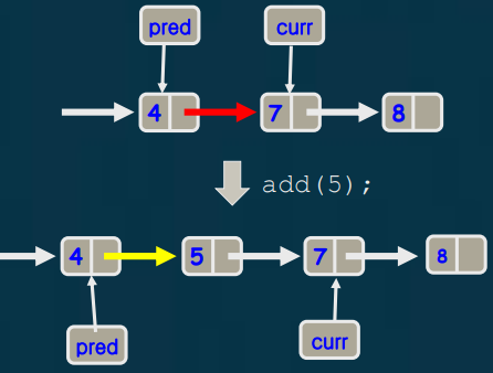 - ๋ค๋ฅธ ์ฐ๋ ๋๊ฐ *pred, *curr ์ฌ์ด์ ์๋ก์ด ๋ ธ๋๋ฅผ ๋ผ์ ๋ฃ์ผ๋ฉด? → pred์ next๊ฐ curr์ธ ๊ฒ์ ํ์ธํ๋ฉด์ ๋ณ๊ฒฝ