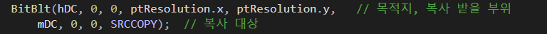 BitBlt(hDC, 0, 0, ptResolution.x, ptResolution.y, // ๋ชฉ์ ์ง, ๋ณต์ฌ ๋ฐ์ ๋ถ์