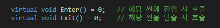 ์ฌ์ Enterํจ์์ Exitํจ์์๋ ๊ฐ๊ฐ ์ฌ์ ์ง์ ํ ๋์ ํ์ถํ ๋ ํด์ผ ํ๋ ์์ ์ ์ํํด์ผ ํ๋ค. ์ด Enter()์ Exit()๋ ๋ชจ๋ ์ฌ์ ํฌํจ๋์ด์ผ ํ๊ธฐ์ ๋ถ๋ชจ์ธ ์ฌ ํด๋์ค ๋ด๋ถ์์ ๊ฐ์ ํจ์๋ก ๋ง๋ค์ด ์์ ๋ฐ๊ณ ์๋ ์์ ๋ฐ๋ ์์ ํด๋์ค๊ฐ ์์ ๋ง์ ๋ฒ์ ์ ๊ตฌํํ๋๋ก ๊ฐ์ ํด์ผ ํ๋ค. ( ์ฆ Enter๊ณผ Exit ํจ์๋ ์ฌ๊ธฐ์ ์ธํฐํ์ด์ค ํจ์์ )