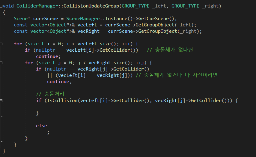 CollisionUpdateGroup ํจ์ : ๋ ๊ฐ์ ์ค๋ธ์ ํธ ๊ทธ๋ฃน ๊ฐ์ ์ถฉ๋์ ์ ๋ฐ์ดํธํ๋ ํจ์๋ก ํ์ฌ ์ฌ(currScene)์ ๊ฐ์ ธ์ ๊ฐ ๊ทธ๋ฃน์ ์ํ๋ ์ค๋ธ์ ํธ ๋ฒกํฐ๋ฅผ ๊ฐ์ ธ์จ๋ค. ์ด๋ ๋ณต์ฌํ์ง ์๊ณ ์ฐธ์กฐ๋ฅผ ์ฌ์ฉํ๋ค.