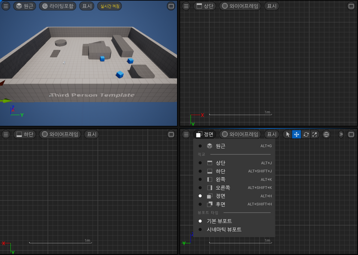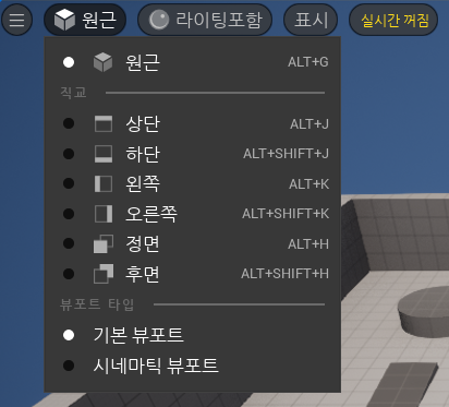 | RMB + Drag | (์๊ทผ ๋ชจ๋) ๋ทฐํฌํธ ์นด๋ฉ๋ผ๋ฅผ ํ์ (์ง๊ต ๋ชจ๋) ๋ทฐํฌํธ ์นด๋ฉ๋ผ๋ฅผ ํจ๋ |